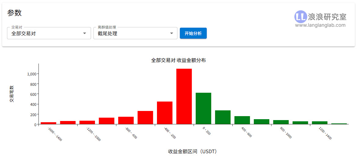 请仔细观察图表左侧(红色区域)的分布。你会发现一个非常有趣的现象: 在 -200 USDT 以内的亏损笔数最多(高达 1098 笔),而随着亏损金额增大,柱子迅速变短,呈现出一个陡峭的断崖。