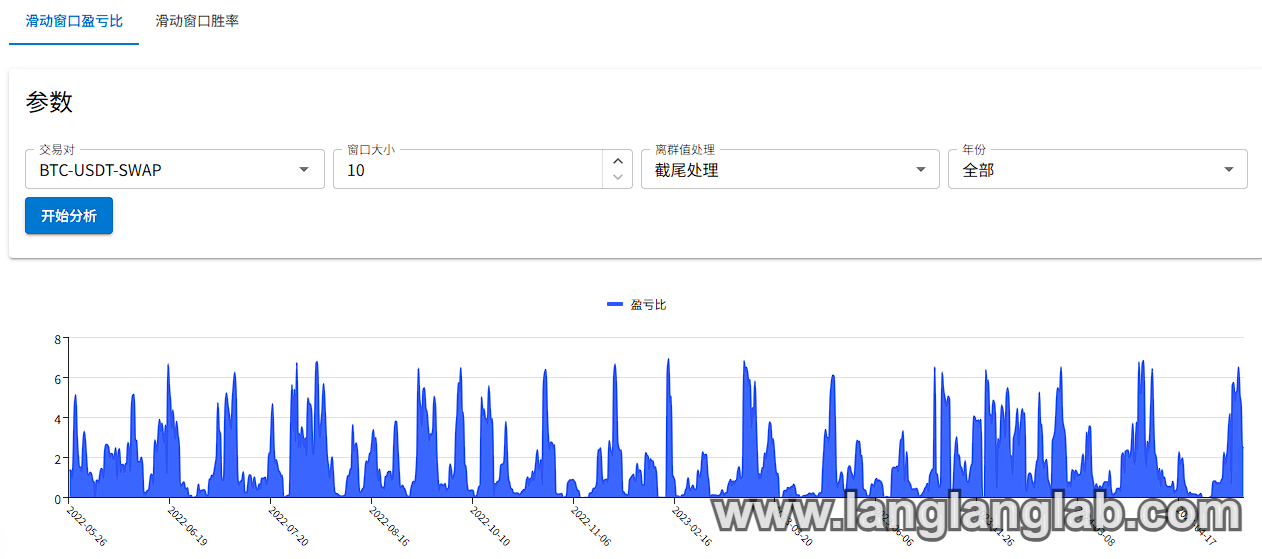 最近整理了一位交易员从 2022 年到 2024 年在 BTC-USDT-SWAP 上的完整滑动窗口数据。把“盈亏比”和“胜率”这两组数据对在一起看的时候,我发现了一个非常典型、甚至有些极端的生存样本。